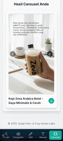 Buat konten carosel tanpa perlu jago canva, cukup upload produk, langsung jadi!