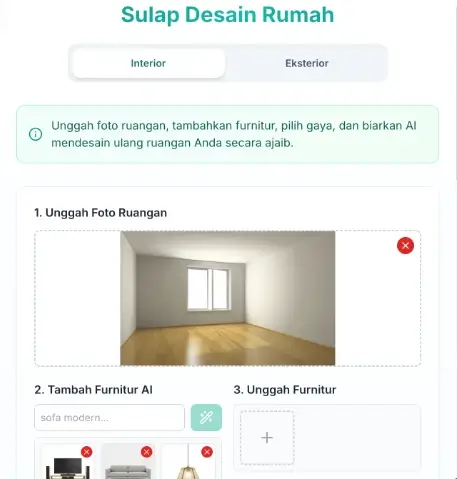 Foto ruangan kamu, tambahkan furnitur, biarkan sulap foto mendesainnya!