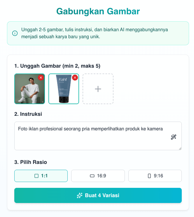Unggah 2-5 gambar, tulis instruksi, dan biarkan AI menggabungkannya menjadi sebuah karya baru yang unik.
