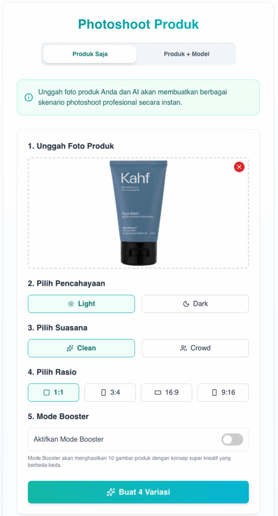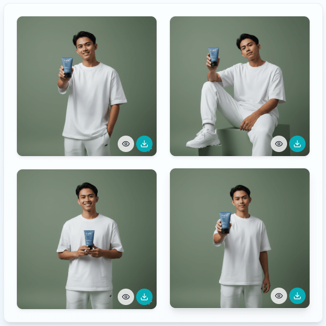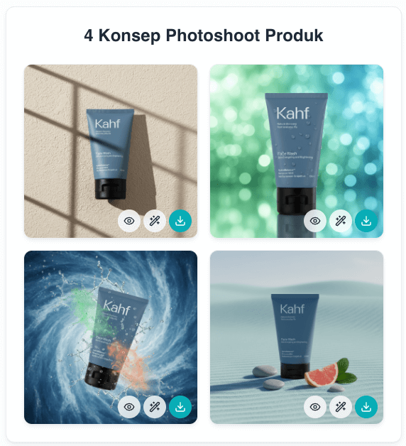 Unggah foto produk Anda dan AI akan membuatkan berbagai skenario photoshoot profesional secara instan.